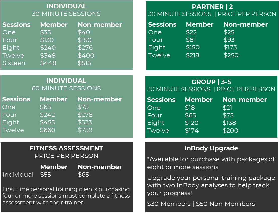 Working with a personal trainer allows clients to maximize the benefits of their exercise routine. Our nationally certified personal trainers offer individual, partner, and group training packages to fit your budget. Our trainers guide individuals with various needs and goals, including weight loss, increasing strength and endurance, toning, reducing stress, sports performance, chronic disease management, and more!