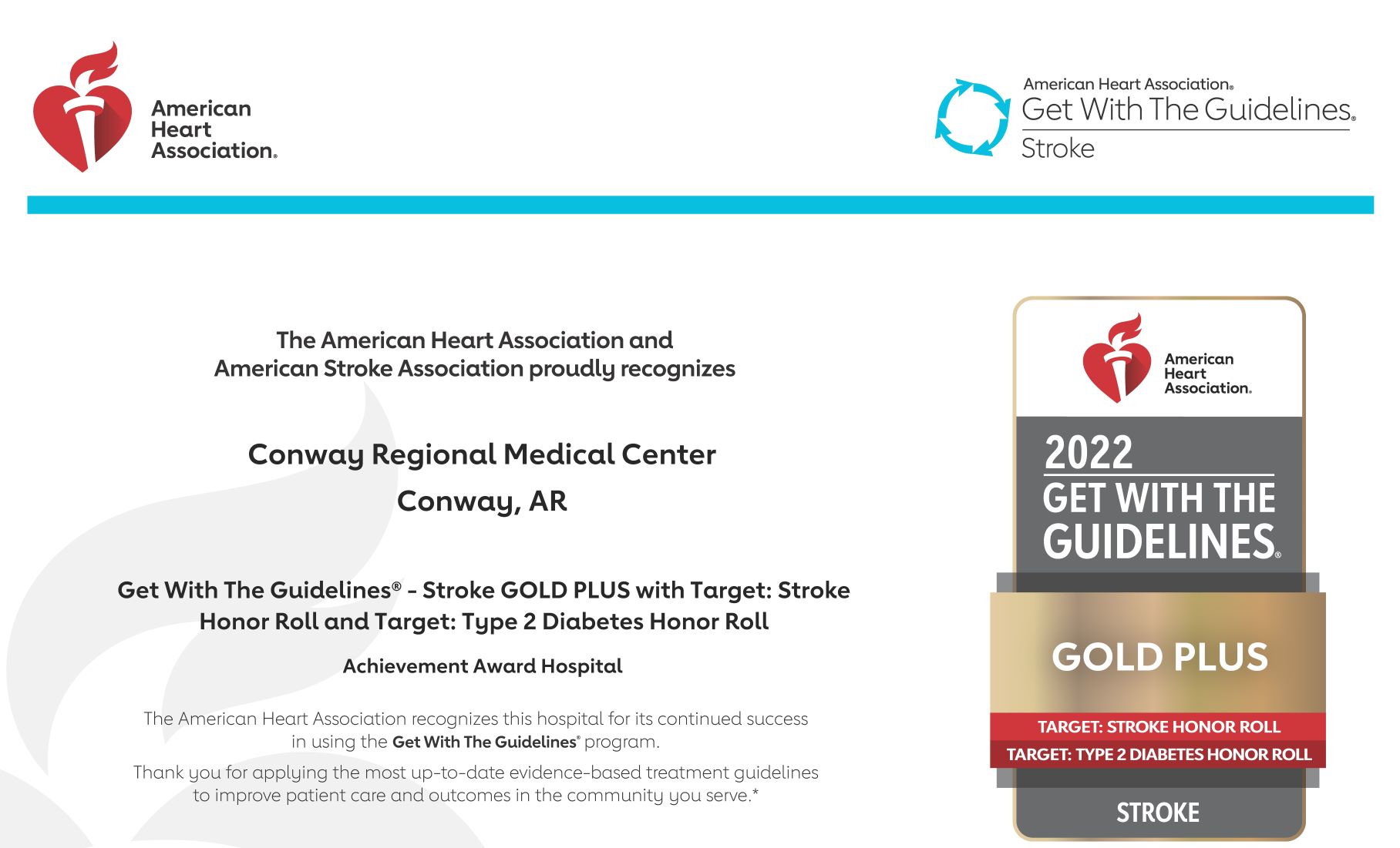 Conway Regional received the AHA’s Gold Plus, Target Stroke Honor Roll and Target Type 2 Diabetes Honor Roll awards for its commitment to ensuring stroke patients receive the most appropriate treatment based on nationally recognized, research-based guidelines.